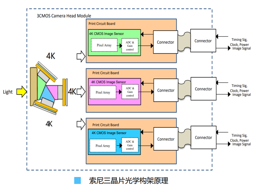 目前市面上号称4K三晶片的摄像机,其构架均是采用3个1080P的CMOS搭建的,再通过后端插值输出3840*2160分辨率,原则上仍属于FULL HD 1080P的解析度。
