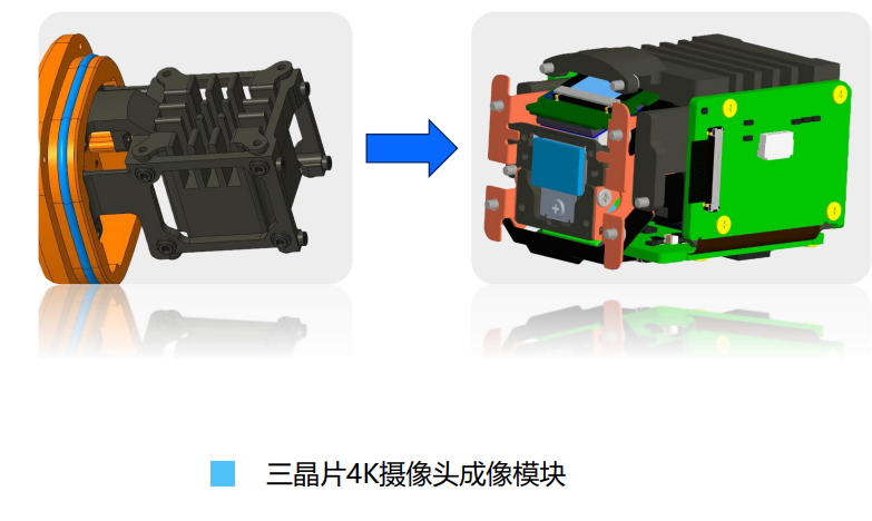 本摄像系统搭载SONY原装三晶片4K摄像头模组,采用3颗原生4K的传感器。 后端搭配XILINX的FPGA图像实时处理系统。