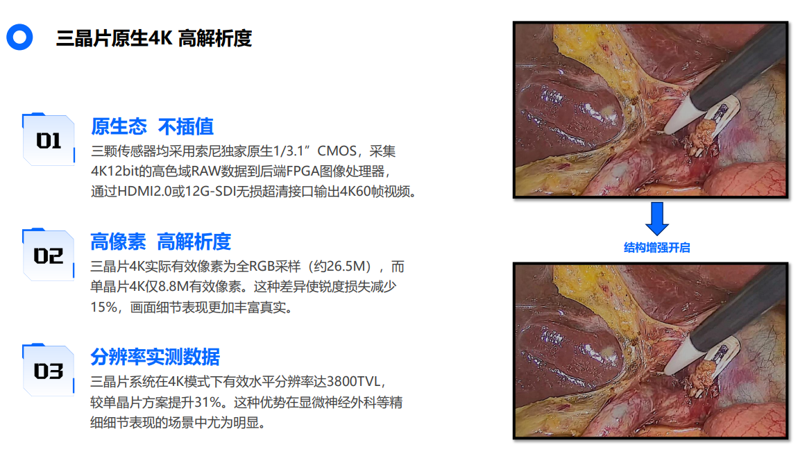 全球首款唯一3颗4K传感器的医用摄像系统,本摄像系统搭载SONY原装3 CMOS摄像头模组,采用3颗原生4K的传感器。 后端搭配XILINX的FPGA图像实时处理系统。 是全球唯一一款已经量产适用于医疗内窥镜和外科手术显微镜的三晶片4K摄像系统。