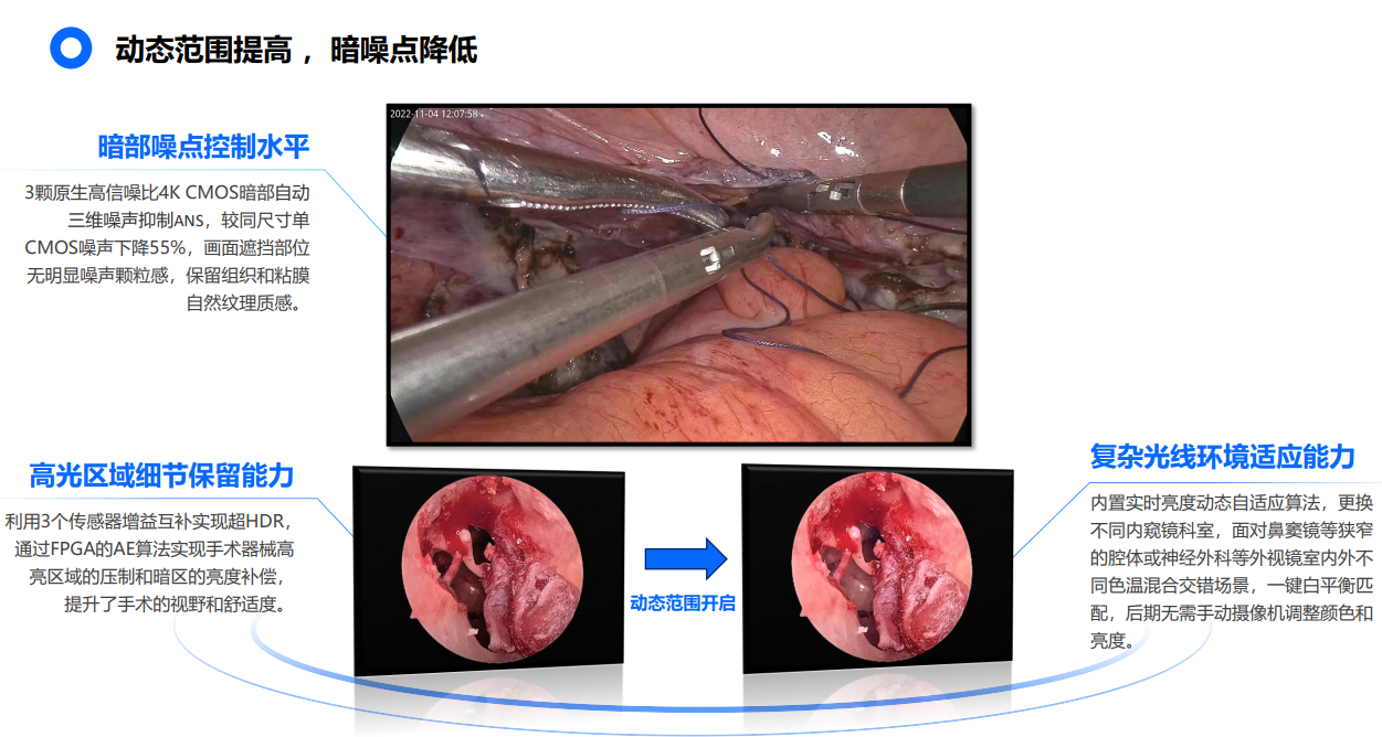 单芯片因马赛克滤镜易在细密纹理处产生伪彩与摩尔纹;三晶片架构从 源头消除这一缺陷, Macbeth 24色卡测试ΔE均值<1.2,优于电影级 ≤3的行业基准;Rec.2020覆盖率可达87%, DCI-P3达99%,针对医 疗场景时色彩层次更丰富,无限接近于真实手术场景。