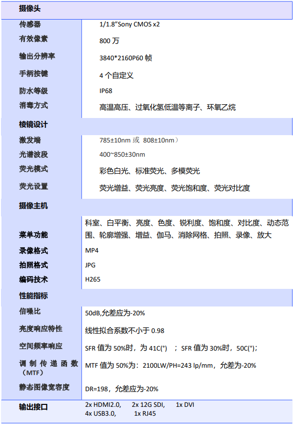 o 支持同屏显示 4K 高清白光、4K 荧光、融合荧光等模式。 o 适配吲哚箐绿(ICG)785nm±10nm 和 808±10nm 激发血管造影。