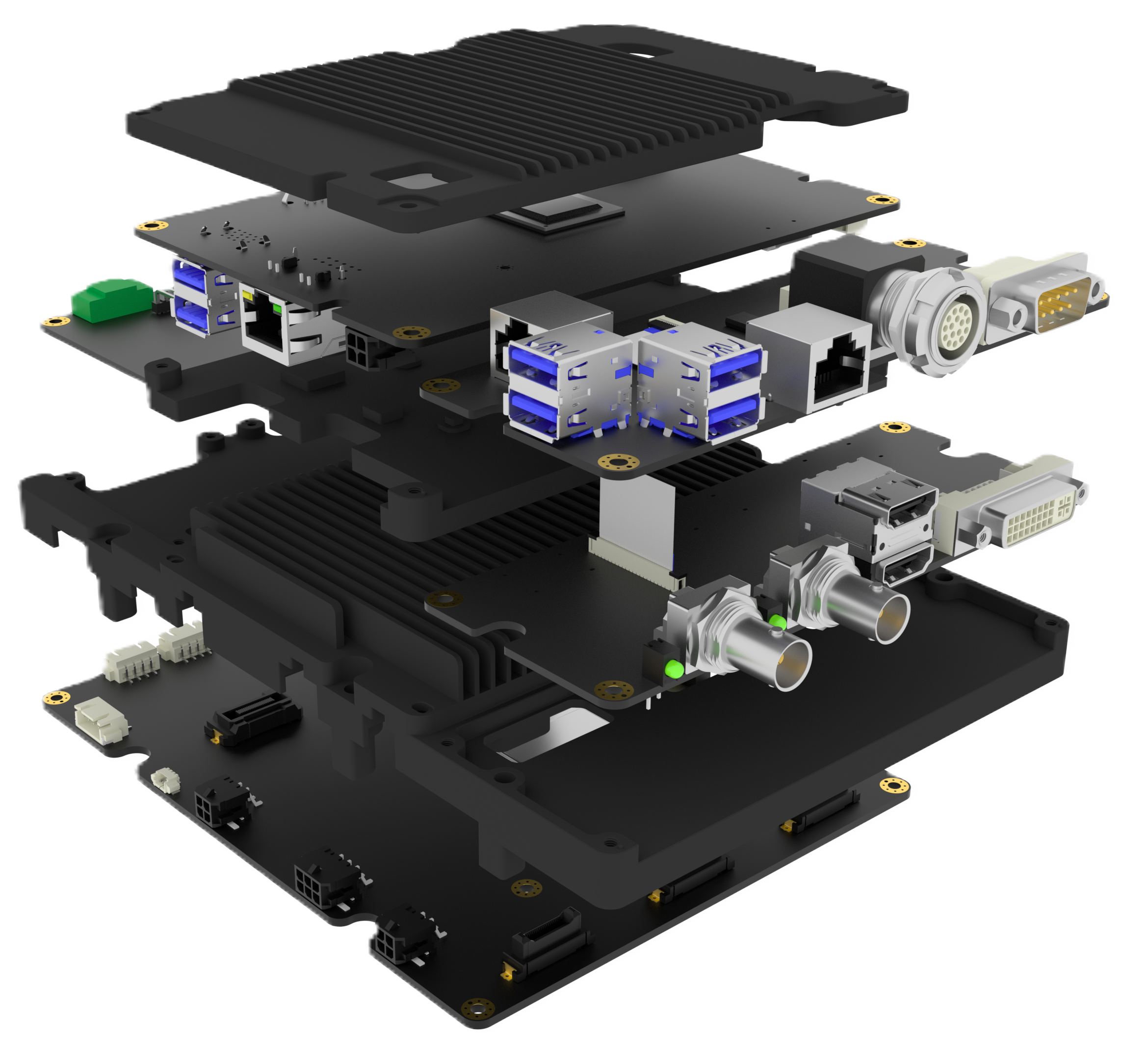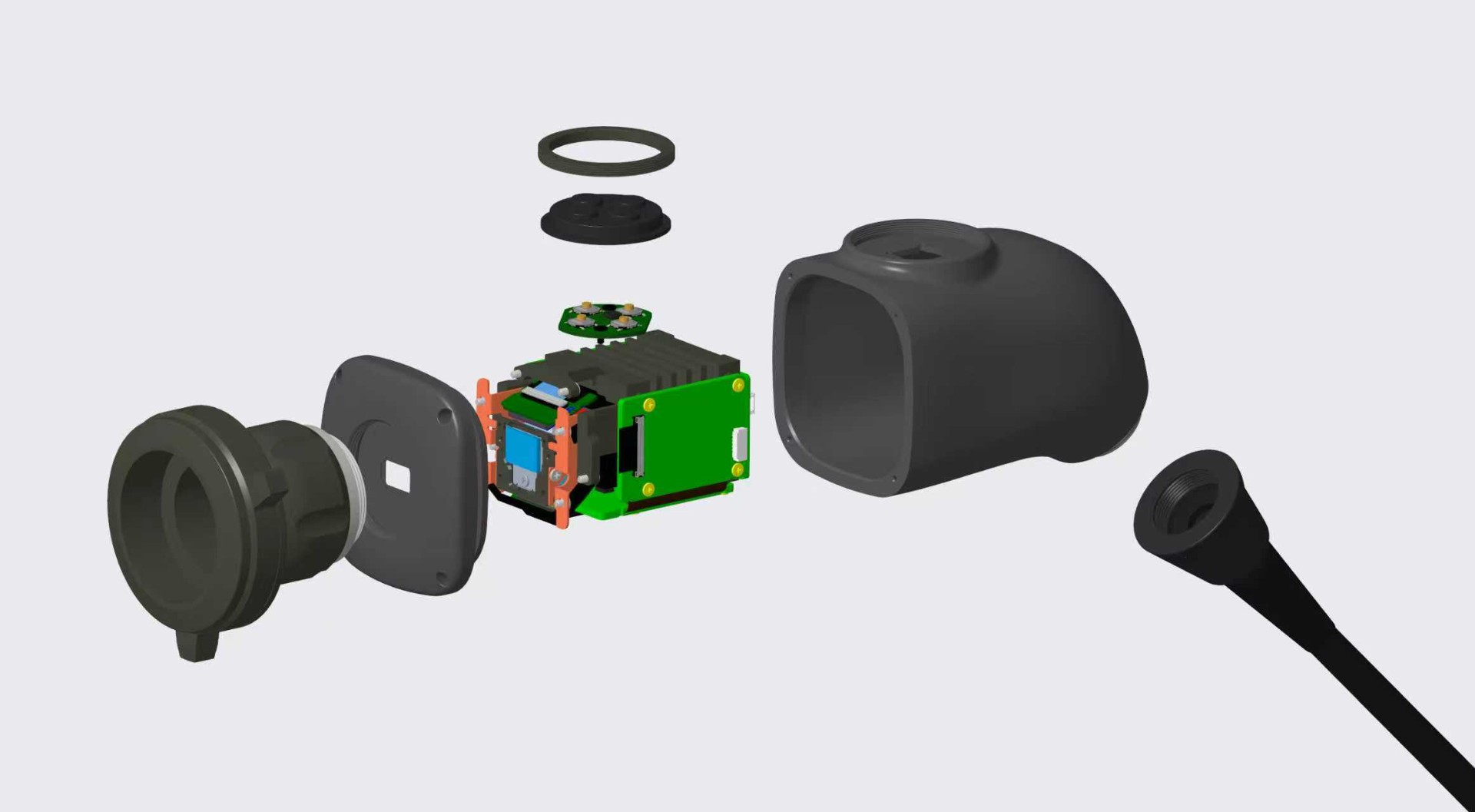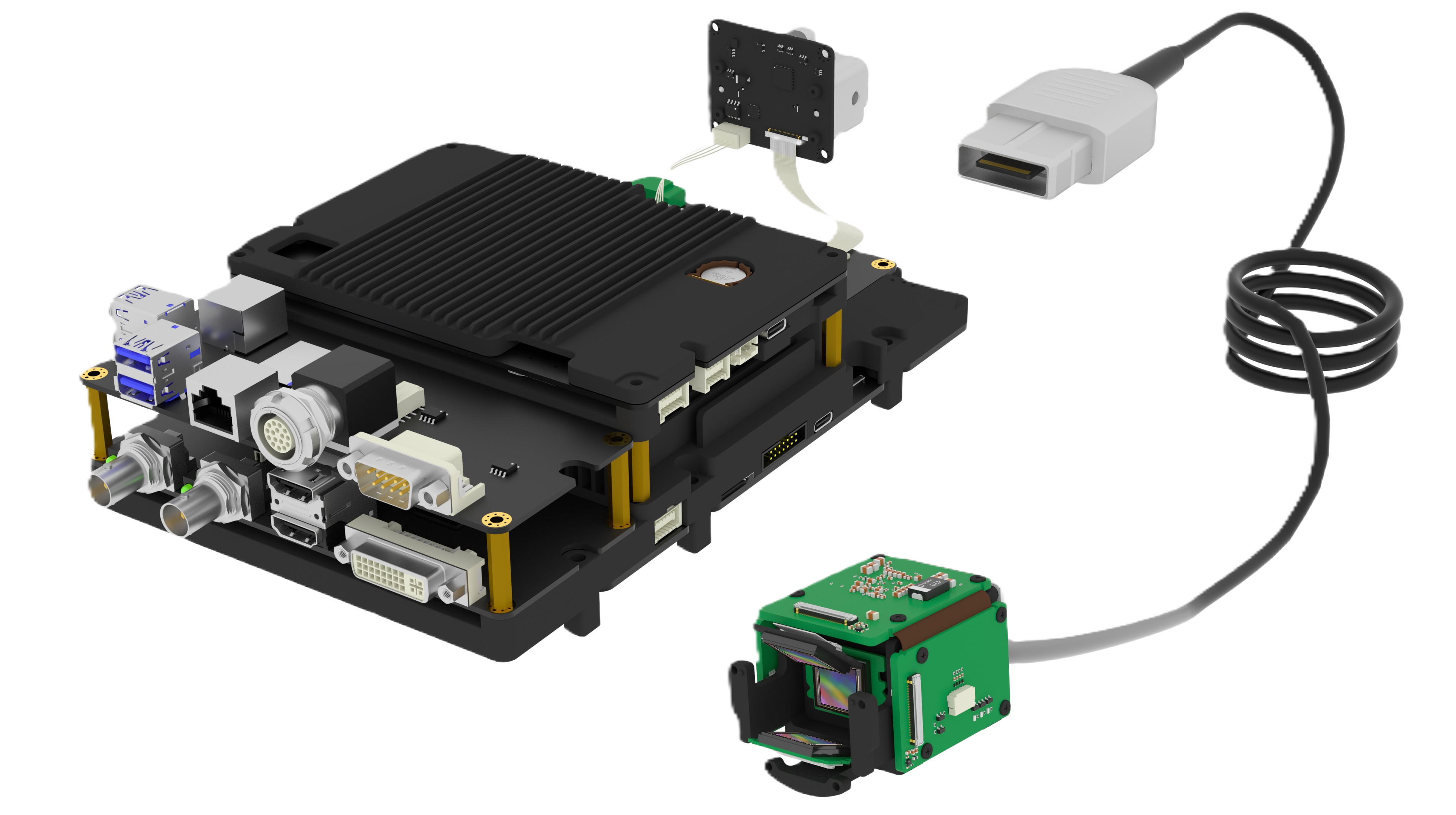 多个模块化的全铝散热器结合,高精度切合 PCB电路板元器件,在振动、粉尘恶劣环境下保持散热稳定性,满足UL94V0等严格安全标准。 最终使三晶片摄像头支持苛刻的医疗高温高压消毒标准。
