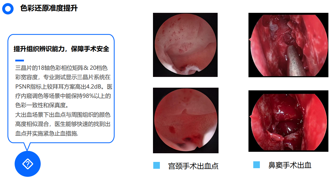单芯片因马赛克滤镜易在细密纹理处产生伪彩与摩尔纹;三晶片架构从 源头消除这一缺陷, Macbeth 24色卡测试ΔE均值<1.2,优于电影级 ≤3的行业基准;Rec.2020覆盖率可达87%, DCI-P3达99%,针对医 疗场景时色彩层次更丰富,无限接近于真实手术场景。